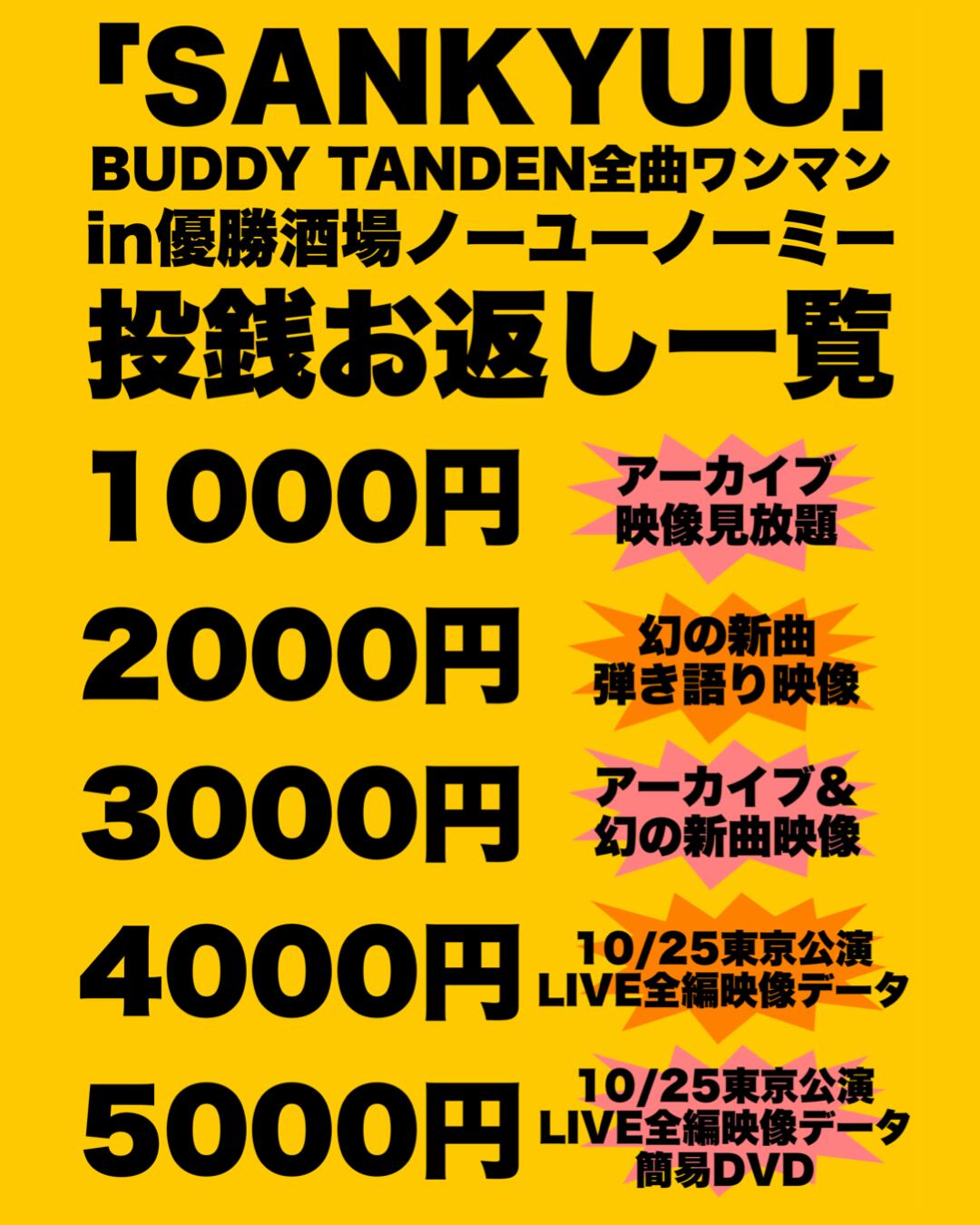 11/24(月祝)昭和町ノーユーノーミーにて行われた『BUDDY TANDEN presents "全曲ワンマン"配信への投銭特典です。 ノーユーノーミーのツイキャスページにあるこの日のライブ全編のアーカイブがいつでも視聴頂ける様になります。
